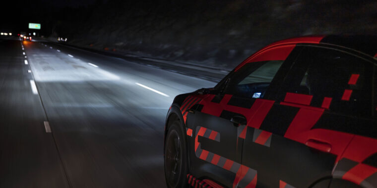 An Audi e-tron prototype on the highway in Europe uses adaptive beam headlights to light the way ahead.